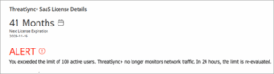 - Nach 24 Stunden prüft ThreatSync+ die Lizenznutzung erneut. Liegt die Nutzung unter dem Lizenzlimit, wird die Überwachung fortgesetzt.